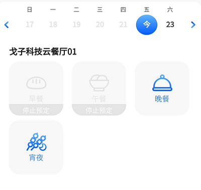 ①用戶點(diǎn)擊上方日期,可預(yù)定對(duì)應(yīng)日期的餐別。點(diǎn)擊左右箭頭圖標(biāo),可進(jìn)行周期切換。