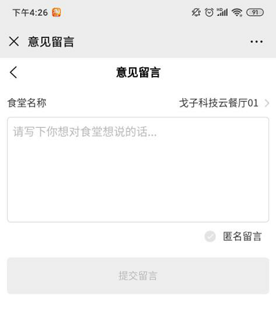 ①點(diǎn)擊食堂名稱,可選擇要留言的食堂