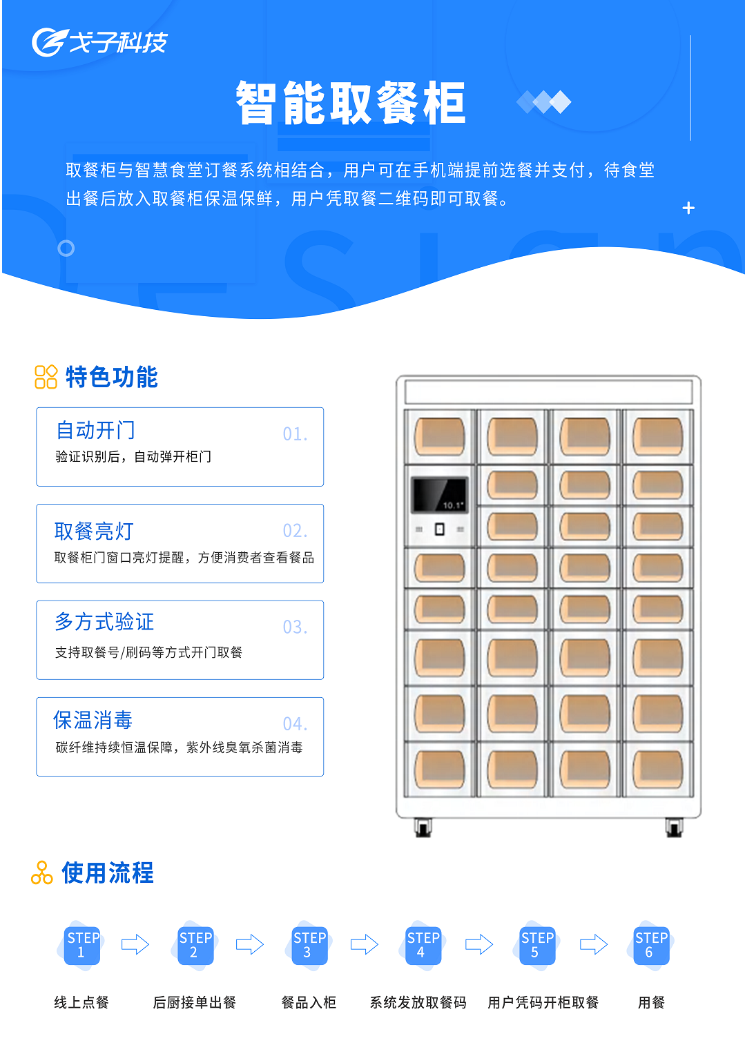 戈子科技智能取餐柜有保溫、加熱、制冷、消毒等多種功能,可以分散放置在食堂、員工辦公區(qū)內(nèi),緩解員工排隊(duì)擁擠,工作忙沒有時(shí)間去食堂取餐問題。訂餐人員根據(jù)收到的取餐二維碼在餐柜掃碼自提,簡(jiǎn)單方便,隨時(shí)都可吃到的飯菜。