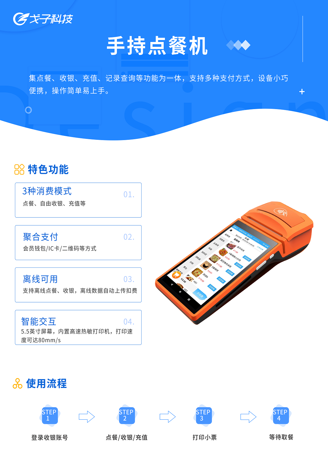 手持機(jī)適用于餐飲,零售,商超,生鮮,日化等收銀場景,提供軟硬一體化產(chǎn)品支持預(yù)訂,排隊(duì)叫號,點(diǎn)菜收銀,會員營銷,報(bào)表等服務(wù)!