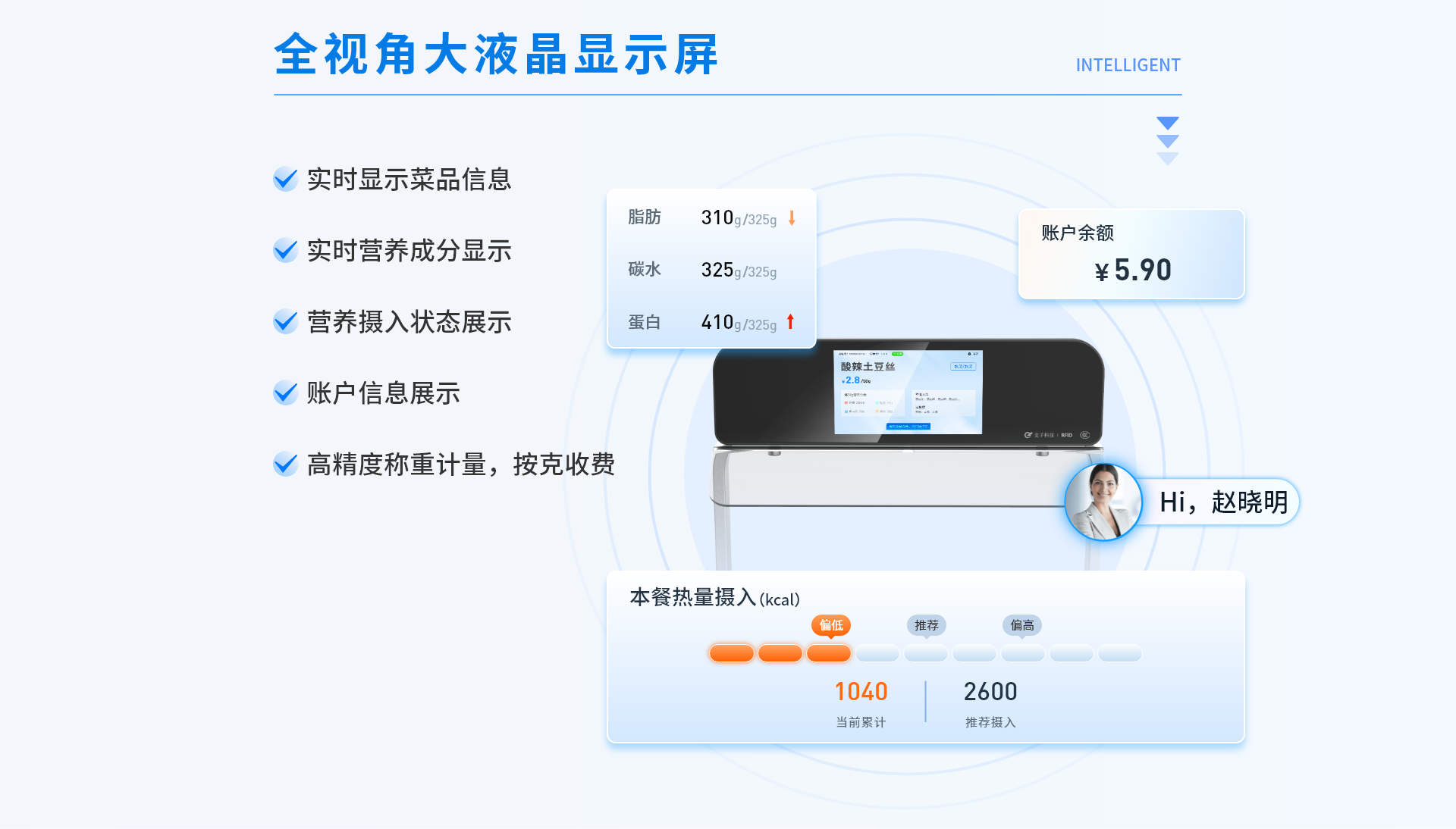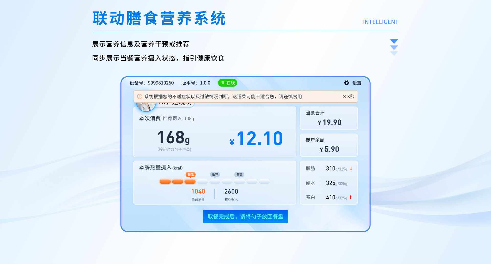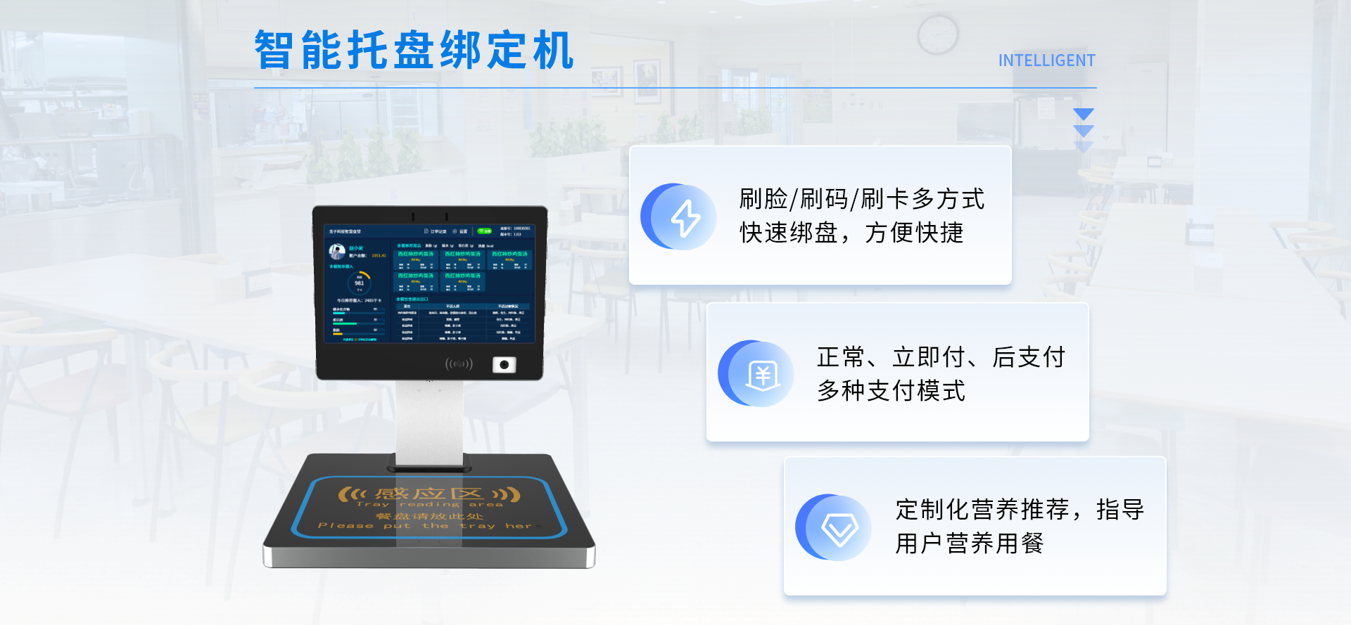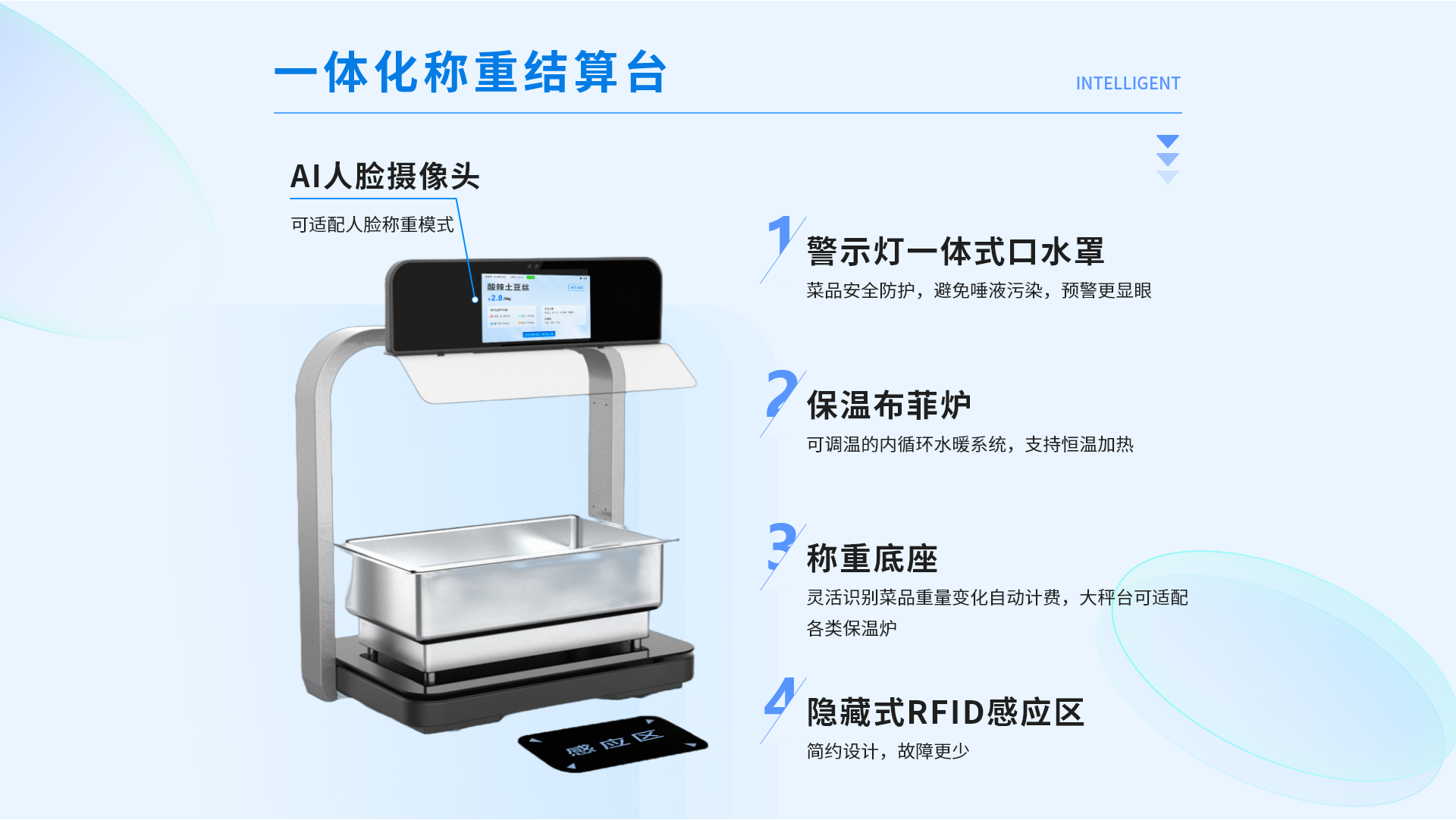 智能稱重結(jié)算臺一體化設(shè)計,基于餐飲云平臺為就餐者提供的無感支付、自助餐飲的智能化集成式系統(tǒng)。用戶綁定托盤后,通過托盤感應(yīng)臺讀取托盤信息,即可在多個智能秤上自助稱重取餐,取餐完成后通過空中支付進行就餐結(jié)算。
