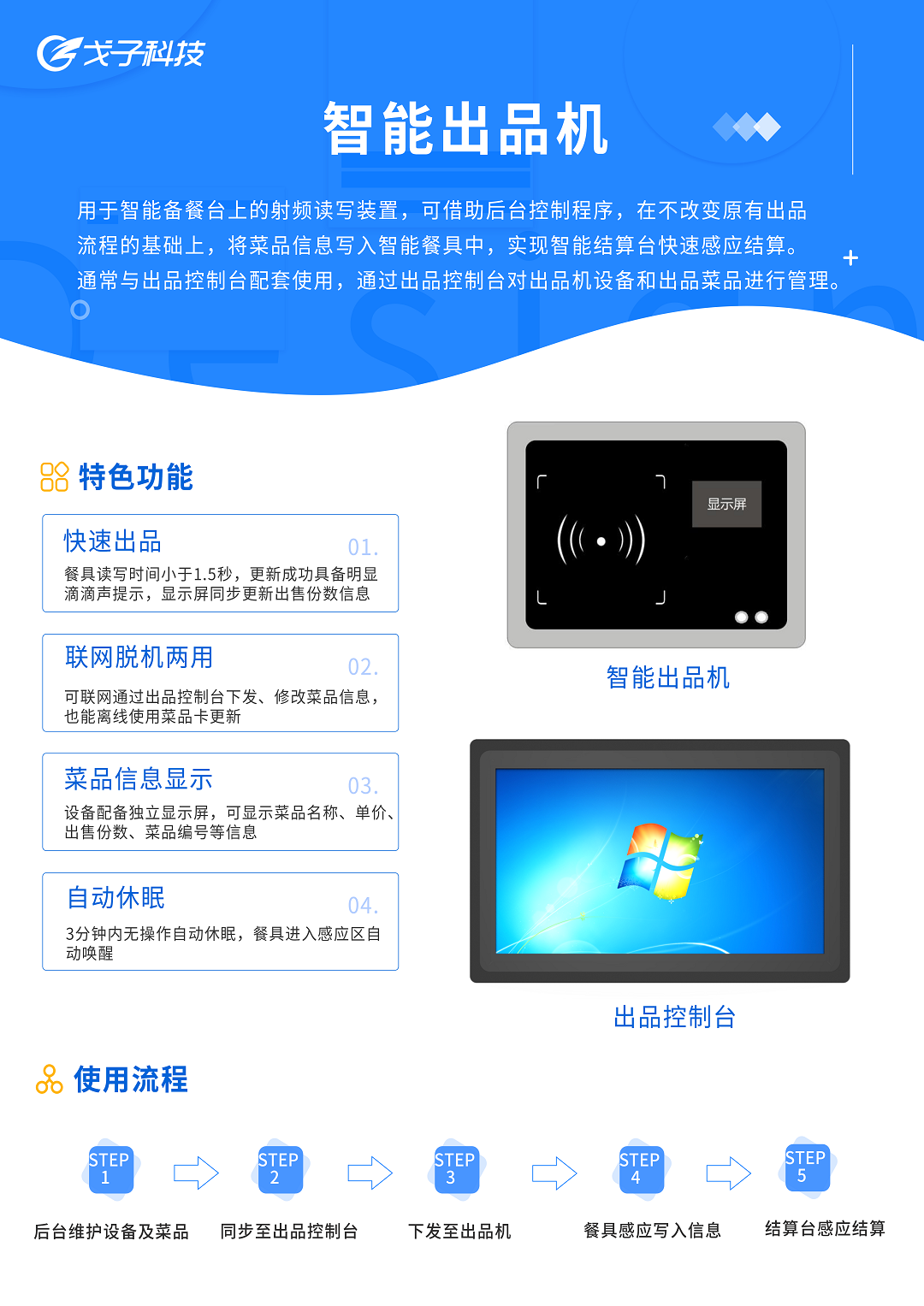 戈子科技智能出品機(jī)(嵌入式)是嵌入在智能備餐臺(tái)上的射頻讀寫(xiě)裝置,可借助后臺(tái)控制程序,在不改變?cè)谐銎妨鞒痰幕A(chǔ)上,將菜品信息寫(xiě)入智能餐具中,以實(shí)現(xiàn)智能結(jié)算臺(tái)通過(guò)芯片感應(yīng)寫(xiě)入的菜品信息進(jìn)行快速結(jié)算。通過(guò)智能出品管控系統(tǒng),可以統(tǒng)一餐盤(pán)顏色,減少餐盤(pán)分類分揀,減少后廚人員清洗工作量。