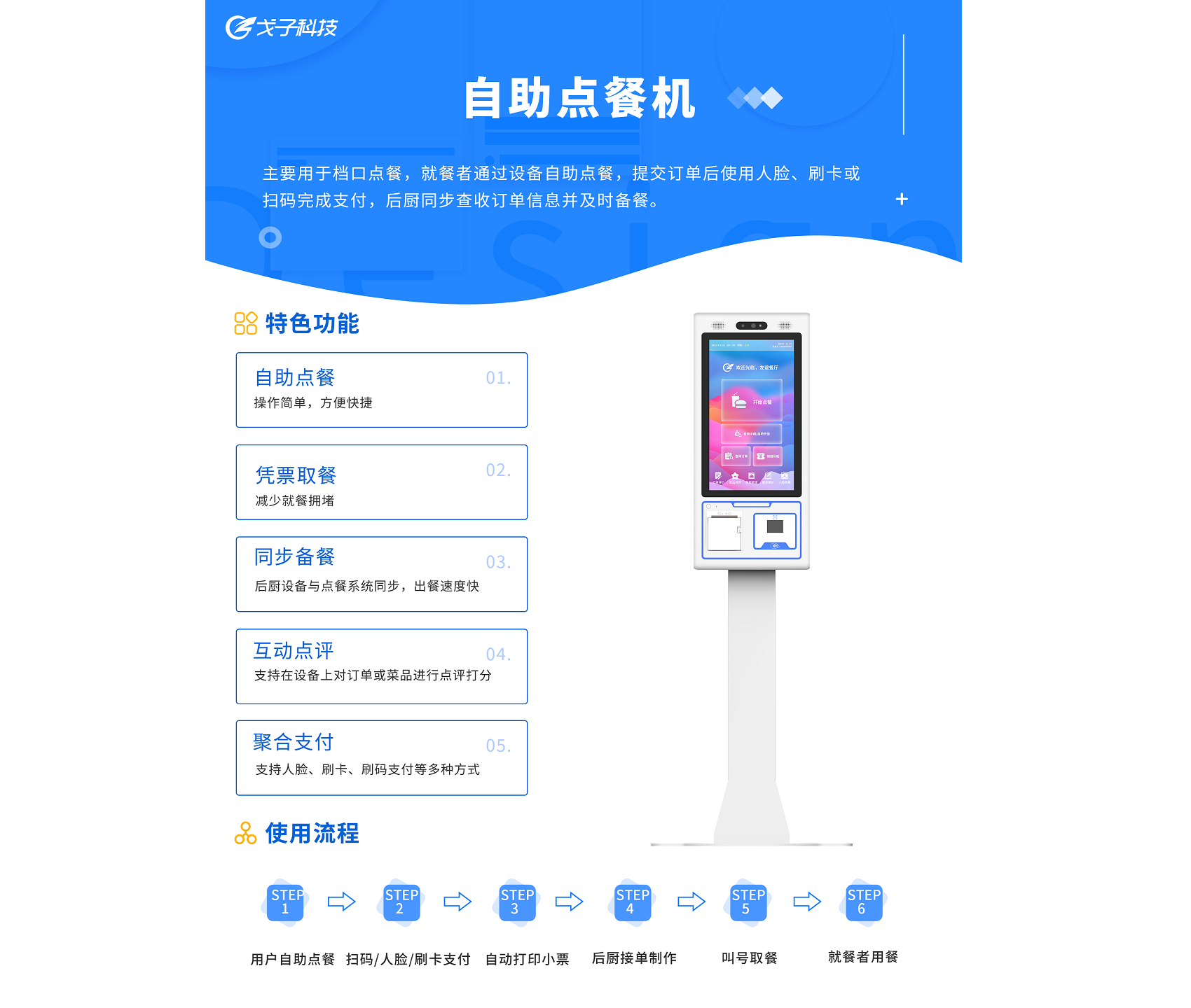 戈子科技自助點餐機有效利用自助點餐系統(tǒng)搭合理搭配叫號取餐系統(tǒng),人臉收銀等設(shè)備硬件,無縫整合智慧餐廳的前端硬件和軟件,后廚系統(tǒng),實現(xiàn)對餐廳的集成化智能管理。在提高用戶點餐訂購效率和餐廳管理的同時提升顧客整體點餐體驗與餐廳檔次。